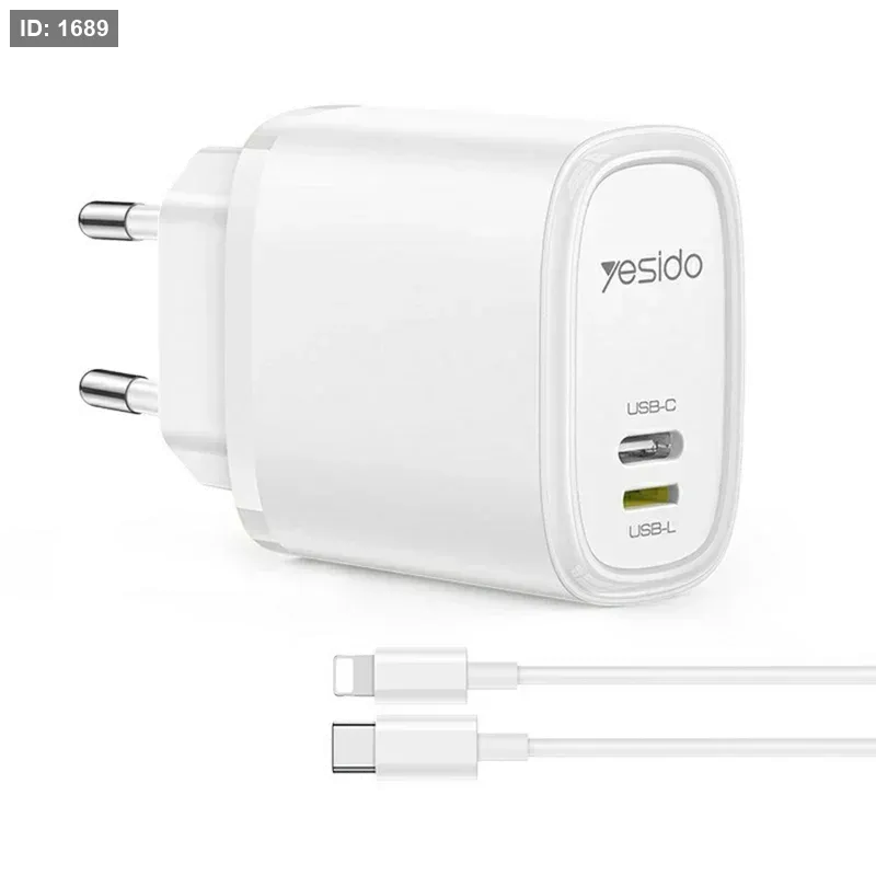 Charger/Adapter 220V / YESIDO YC71 12W / 1xPD, 1xLightning(iPhone) + Type-C - Lightning Cable