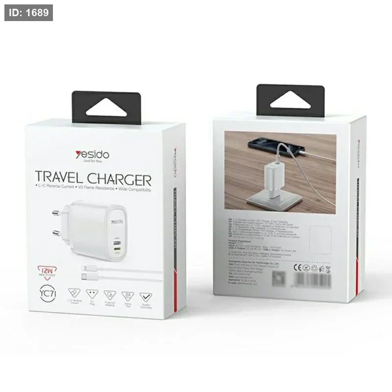 YESIDO YC71 USB-C+USB-L Dual Port Charger 12W Fast Charging Wall Charger Adapter