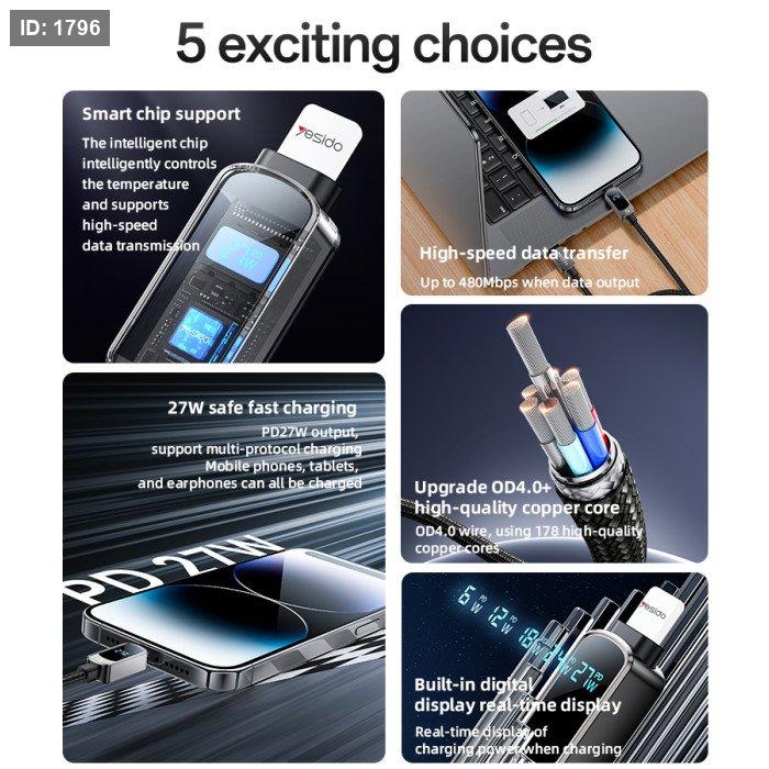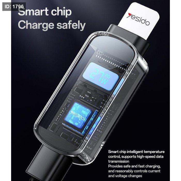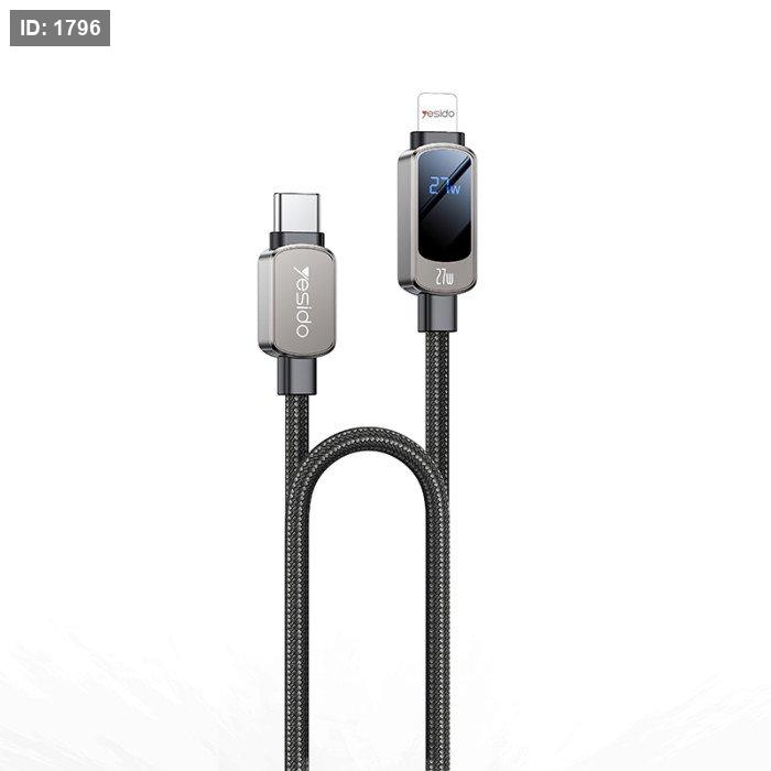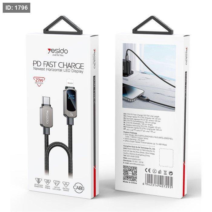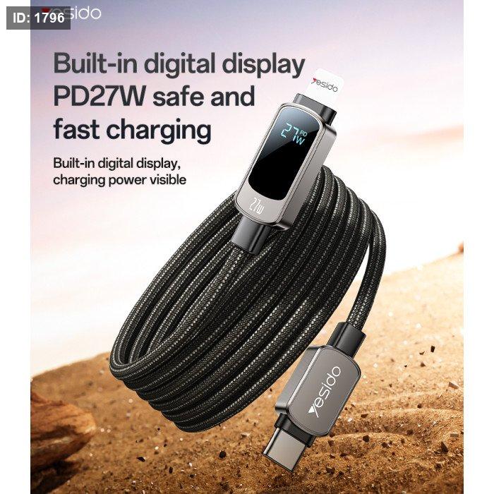 CA180 Yesido Zinc Alloy 1.2 Meters Length Type-C To IP PD27W Built-in Digital Display Data Cable.