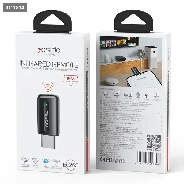 The Yesido EC26C is a compact infrared remote controller that plugs into your Type-C smartphone, instantly transforming it into a universal remote for TVs, air conditioners, fans, set-top boxes, and more. With no Bluetooth or batteries required, it’s the perfect solution for replacing lost remotes or simplifying your smart home setup.
