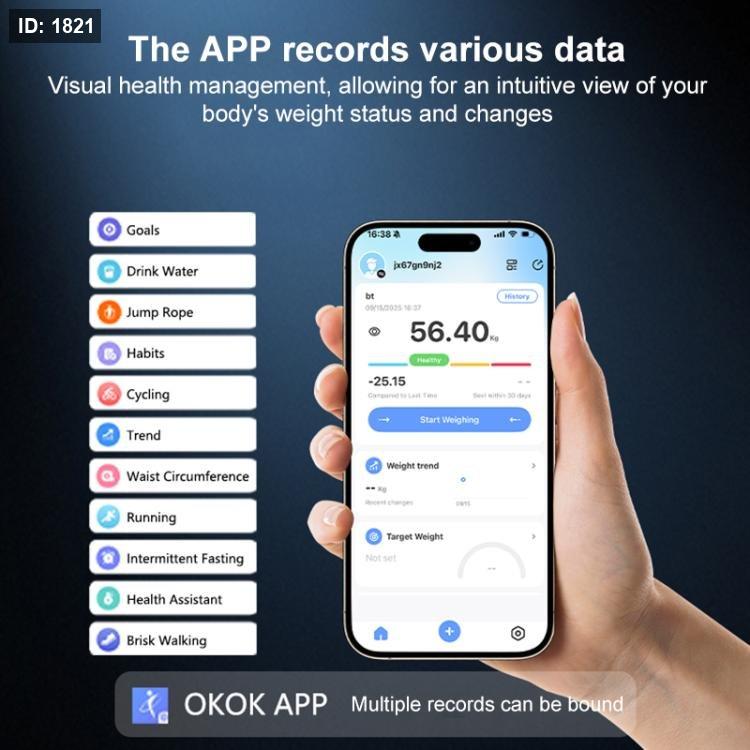 14. Mobile APP displays measured weight, BMI, body fat percentage, muscle percentage, visceral fat, water content, bone mass, and protein.