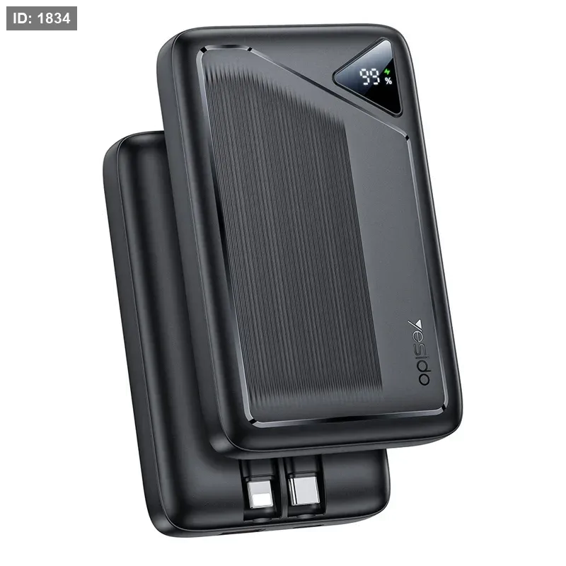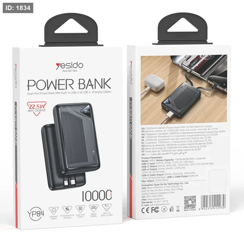 YESIDO YP84 10000mAh Power Bank Digital Display 22.5W Fast Charging Portable Phone Charger with Built-in Type-C 8Pin Cable