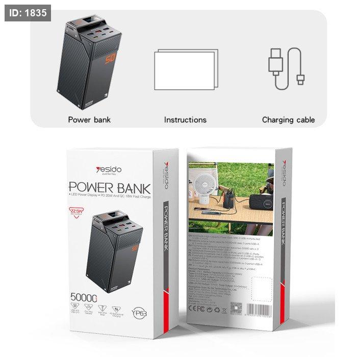 YP63 Yesido 50000mAh PD 20W + SCP 22.5W Fast Charging Zinc Alloy LED Screen Display Six-port Power Bank.